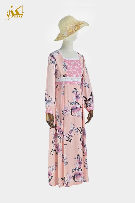 is a beautifully designed dress crafted from soft and breathable fabric. The soothing blue-toned background is decorated with delicate daisy prints, offering a fresh and serene look. The front features elegant lace and contrasting fabric details, enhancing its overall appeal. With snap button sleeves for convenience and an adjustable cross-back strap for a perfect fit, this dress is ideal for both casual and special occasions.