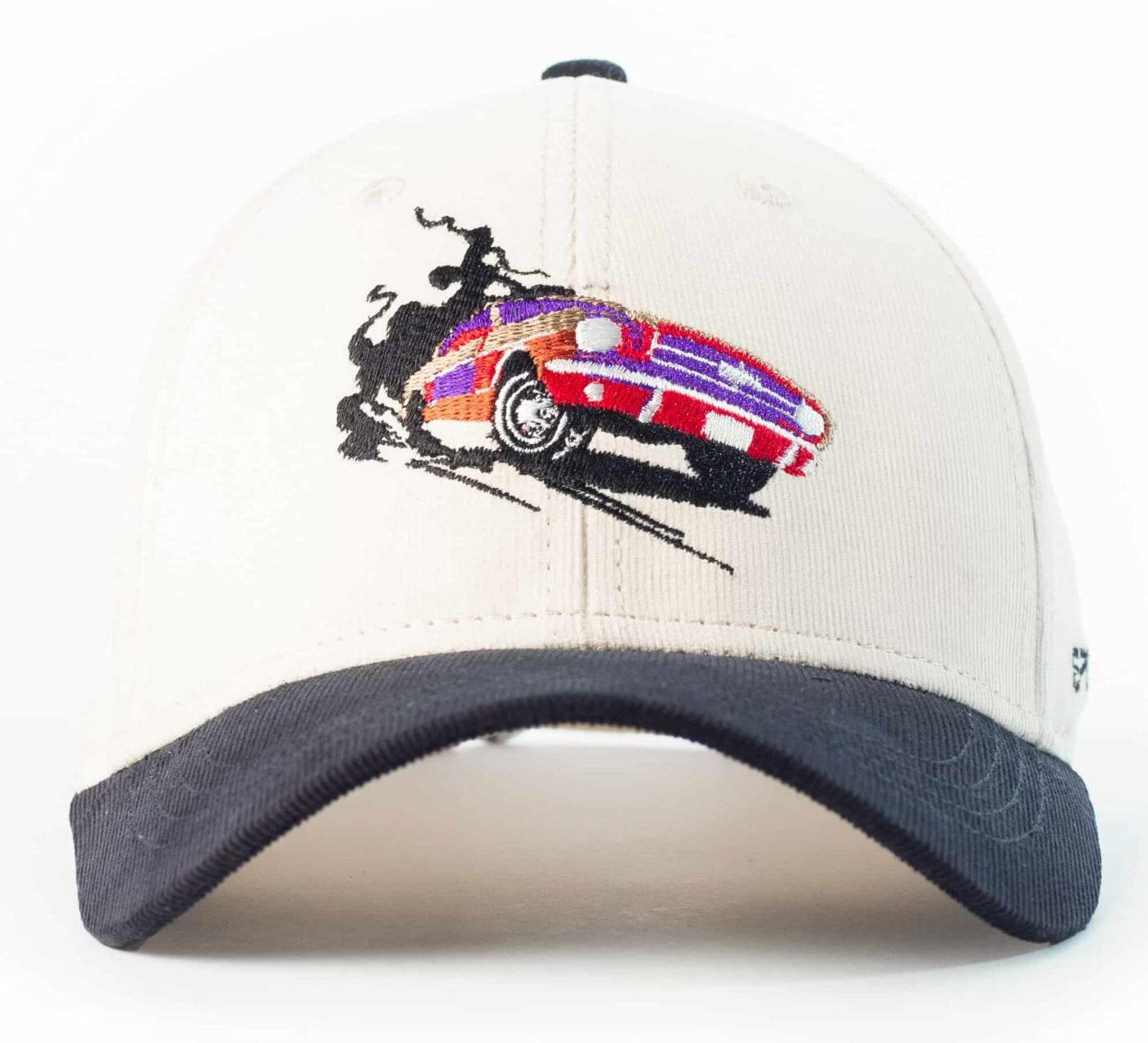 The highlight of this cap is the meticulously embroidered racing car on the front panel in