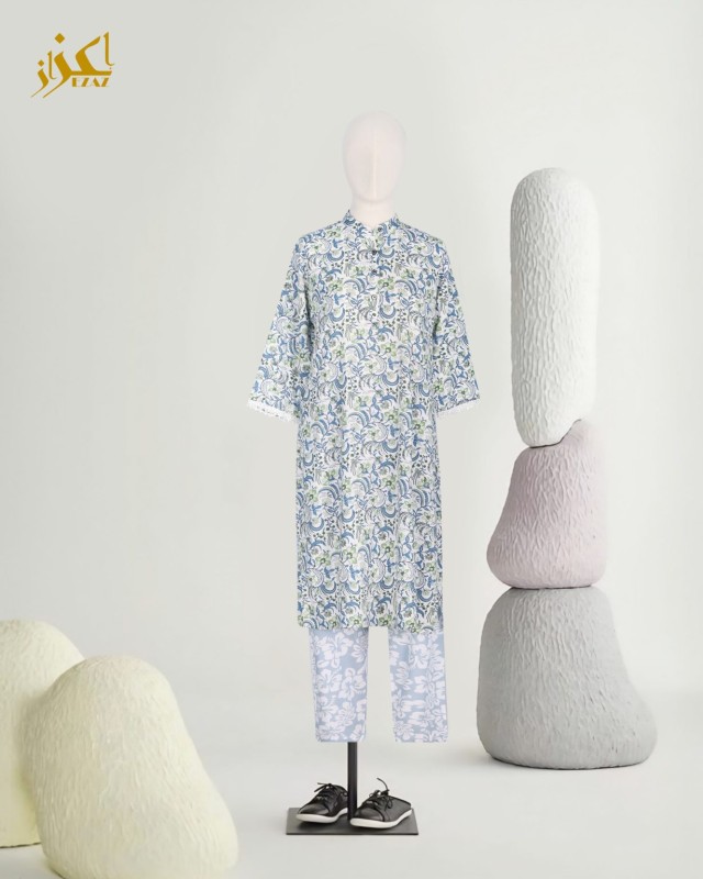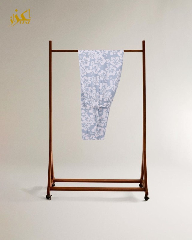 This two-piece set showcases a soft floral print in calming shades of blue and green. The top has a mandarin collar with front buttons, matched with light floral printed pants, creating an elegant and serene outfit.